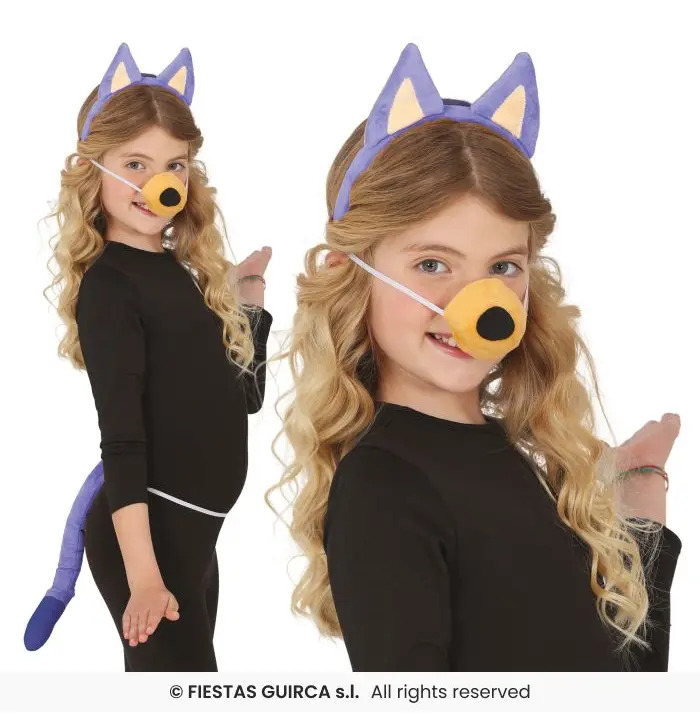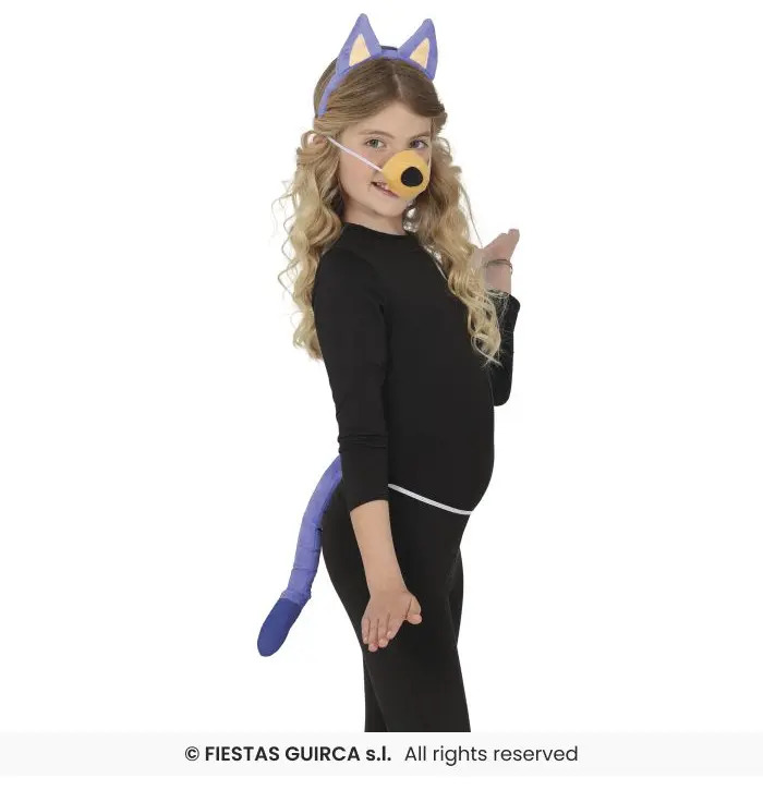 This kids blue dog costume accessory set is perfect for creating a fun and playful dog character for fancy dress and imaginative role play. The set includes a soft blue dog ear headband, a matching dog nose with elastic strap, and a fluffy blue dog tail that attaches easily for comfortable wear. Lightweight and child-friendly, these accessories are ideal for animal-themed costumes, school plays, World Book Day, Halloween, or creative dress-up at home. A simple and versatile set that pairs easily with a plain outfit to transform into an adorable dog costume.