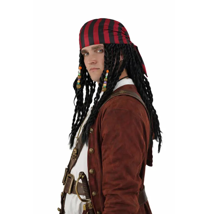 Set sail for adventure with this rugged Pirate Wig with Bandanna, the ultimate accessory for any swashbuckling costume. Featuring long twisted black locks adorned with colourful beads and a bold red-and-black striped bandanna, this wig instantly transforms you into a fearless buccaneer ready to conquer the seas.